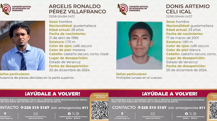Redacción Xalapa.- El pasado 20 de diciembre de 2024 dos ciudadanos guatemaltecos desaparecieron en el estado de Veracruz, por lo que, la Comisión Estatal de Búsqueda emitió fichas para su localización y solicitó el apoyo de la población.