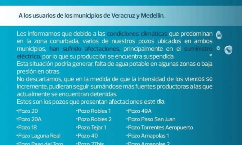 Tal es el caso de los pozos que abastecen de agua a los municipios Veracruz y Medillín. La Comisión Nacional del Agua informó que estas afectaciones se dieron en el suministro eléctrico de las instalaciones.