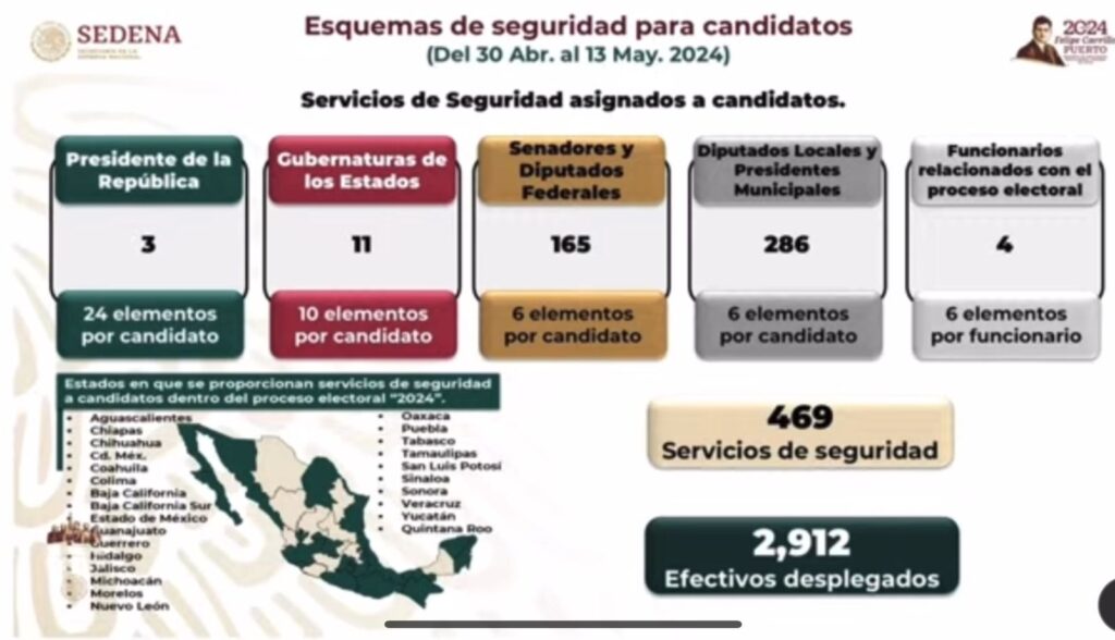 De estos, se da segunda a los 3 candidatos presidenciales con 24 efectivos por candidato, en el caso de los candidatos a gobernadores se da seguridad a 11 de ellos con 10 elementos por cada uno.