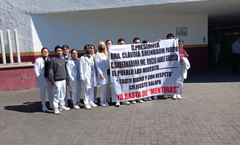 El grupo de Médicos Internos de Pregrado se reunieron en la explanada de la Clínica Hospital, con una pancarta en la que solicitaban la intervención de la presidenta Claudia Sheinabum y de la gobernadora Rocío Nahle García.
