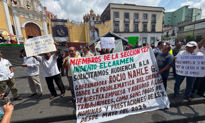 Extrabajadores del ingenio “El Carmen”, municipio de Ixtaczoquitlán, protestaron frente a Palacio de Gobierno, en la ciudad de Xalapa, para denunciar que la empresa cerró sus puertas hace un año, dejó sin empleo a 600 personas y hay adeudos pendientes.