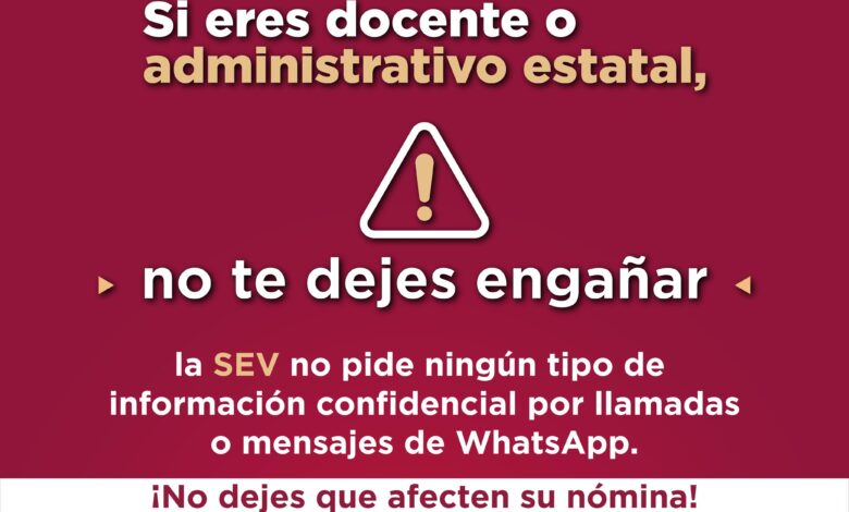 De manera especial, la SEV solicita a las y los trabajadores de la educación no proporcionar información de ningún tipo para que no sean víctimas de algún posible delito, que les afecte en su nómina.