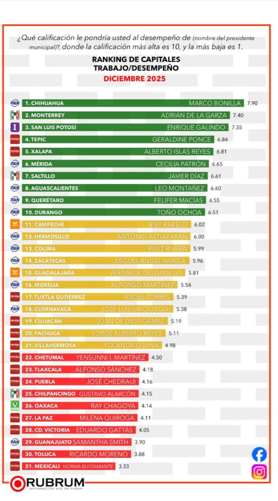 Así lo revela la encuesta “Las 31 capitales estatales”, realizada por la empresa RUBRUM, que se publica este 8 de diciembre.