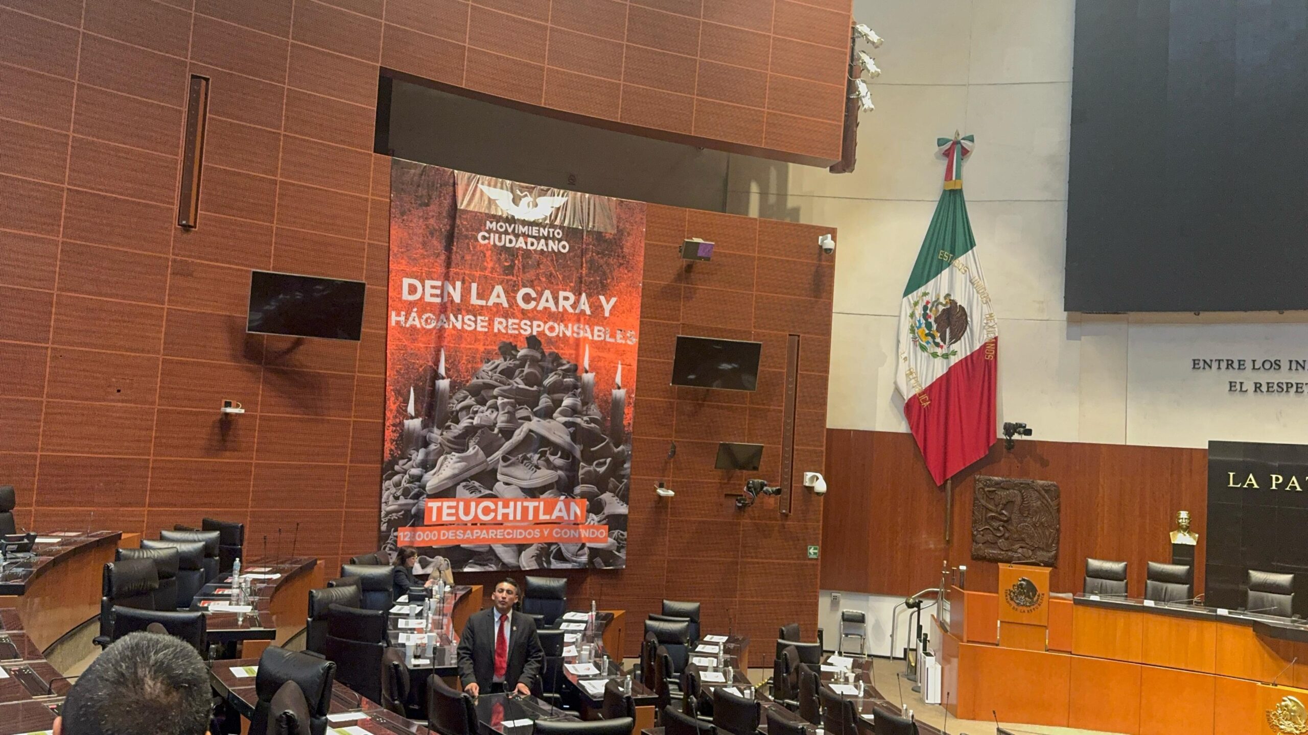 Carlos Guzmán | Corresponsal CDMX La bancada del PRI en el Senado, desplegó en el Salón de Plenos sendas mantas con dedicatorias para Morena y Movimiento Ciudadanos por el caso Teuchitlán.