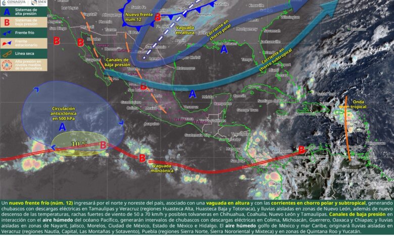 Para hoy, un nuevo frente frío (núm. 12) ingresará sobre el norte y noreste del país, asociado con una vaguada en altura y con las corrientes en chorro polar y subtropical, lo que ocasionará chubascos con descargas eléctricas en Tamaulipas y Veracruz (regiones Huasteca Alta, Huasteca Baja y Totonaca); así como lluvias aisladas en zonas de Nuevo León, propiciando un nuevo descenso de las temperaturas, rachas fuertes de viento de 50 a 70 km/h y posibles tolvaneras en Chihuahua, Coahuila, Nuevo León y Tamaulipas. Canales de baja presión sobre el occidente y centro del territorio nacional, en interacción con el aire húmedo proveniente del océano Pacífico, generarán intervalos de chubascos acompañados con descargas eléctricas en Colima, Michoacán, Guerrero, Oaxaca y Chiapas; y lluvias aisladas en zonas de Nayarit, Jalisco, Morelos, Ciudad de México, Estado de México e Hidalgo. El ingreso de aire húmedo golfo de México y mar Caribe, originará lluvias aisladas en Veracruz (regiones Nautla, Capital, Las Montañas y Sotavento), Puebla (regiones Sierra Norte, Sierra Nororiental y Mixteca) y zonas de Quintana Roo y Yucatán. En el resto del país, se mantendrá baja probabilidad de lluvias.