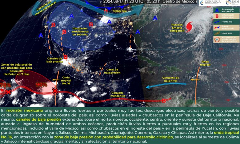 Este día, el monzón mexicano originará lluvias fuertes a puntuales muy fuertes, descargas eléctricas, rachas de viento y posible caída de granizo sobre el noroeste del país; así como lluvias aisladas y chubascos en la península de Baja California. Así mismo, canales de baja presión extendidos sobre el norte, noreste, occidente, centro, oriente y sureste del territorio nacional, aunado al ingreso de humedad de ambos océanos, producirán lluvias fuertes a puntuales muy fuertes en las regiones mencionadas, incluido el valle de México; así como chubascos en el noreste del país y en la península de Yucatán, con lluvias puntuales intensas en Nayarit, Jalisco, Colima, Michoacán, Guanajuato, Guerrero, Oaxaca y Chiapas. Así mismo, la onda tropical No. 16, en interacción con la zona de baja presión con probabilidad para desarrollo ciclónico, se localizará al suroeste de Colima y Jalisco, intensificándose gradualmente, y sin afectación al territorio nacional. Finalmente, se mantendrán temperaturas superiores a 40 °C en zonas de Baja California, Baja California Sur, Sonora, Coahuila, Nuevo León, Tamaulipas y Campeche.
