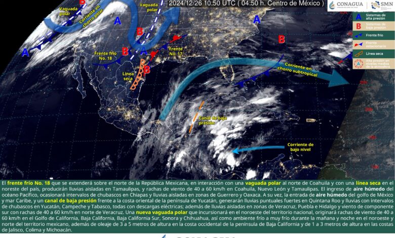 Para hoy, el frente frío No. 18 que se extenderá sobre el norte de la República Mexicana, en interacción con una vaguada polar situada al norte de Coahuila y con una línea seca sobre el noreste del país, producirán lluvias aisladas en zonas de Tamaulipas, y rachas de viento de 40 a 60 km/h en Coahuila, Nuevo León, Tamaulipas y norte de Veracruz. Por otra parte, el ingreso de aire húmedo del océano Pacífico, ocasionará intervalos de chubascos en Chiapas y lluvias aisladas en zonas de Guerrero y Oaxaca. A su vez, la entrada de aire húmedo del golfo de México y mar Caribe, y un canal de baja presión frente a la costa oriental de la península de Yucatán, generarán lluvias puntuales fuertes en Quintana Roo y lluvias con intervalos de chubascos en Yucatán, Campeche y Tabasco, todas acompañadas con descargas eléctricas; además de lluvias aisladas en zonas de Veracruz, Puebla e Hidalgo y viento de componente sur con rachas de 40 a 60 km/h en norte de Veracruz. Finalmente, una nueva vaguada polar que incursionará en el noroeste del territorio nacional, originará rachas de viento de 40 a 60 km/h en el Golfo de California, Baja California, Baja California Sur, Sonora y Chihuahua, así como ambiente frío a muy frío durante la mañana y noche en el noroeste y norte del territorio mexicano, además de oleaje de 3 a 5 metros de altura en la costa occidental de la península de Baja California y de 1 a 3 metros de altura en las costas de Jalisco, Colima y Michoacán.