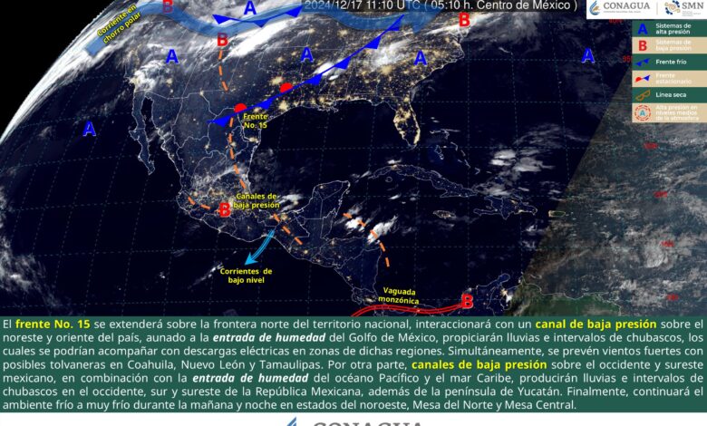Para este día, el frente No. 15 se extenderá sobre la frontera norte del territorio nacional, interaccionará con un canal de baja presión sobre el noreste y oriente del paísaunado a la entrada de humedad del Golfo de México, propiciarán lluvias e intervalos de chubascos, los cuales se podrían acompañar con descargas eléctricas en zonas de dichas regiones. Simultáneamente, se prevén vientos fuertes con posibles tolvaneras en Coahuila, Nuevo León y Tamaulipas. Por otra parte, canales de baja presión sobre el occidente y sureste mexicano, en combinación con la entrada de humedad del océano Pacífico y el mar Caribe, producirán lluvias e intervalos de chubascos en el occidente, sur y sureste de la República Mexicana, además de la península de Yucatán. Finalmente, continuará el ambiente frío a muy frío durante la mañana y noche en estados del noroeste, Mesa del Norte y Mesa Central.
