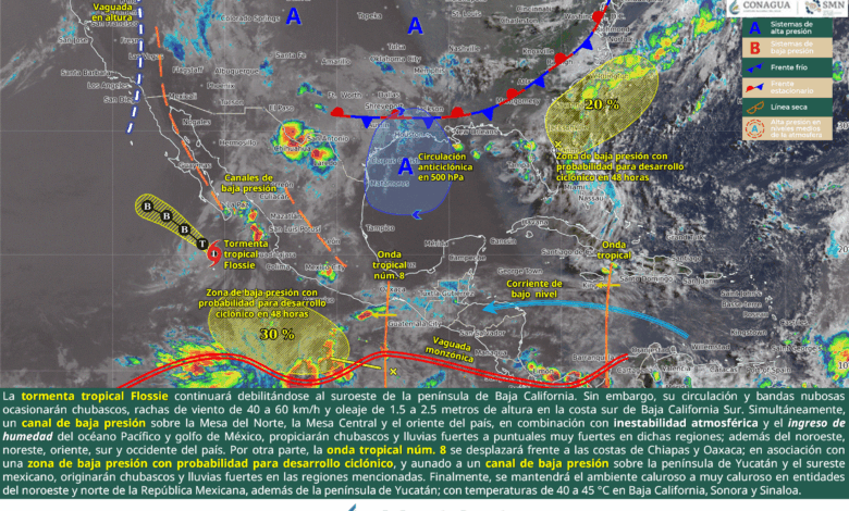 Este día, la tormenta tropical Flossie continuará debilitándose al suroeste de la península de Baja California. Sin embargo, su circulación y bandas nubosas ocasionarán chubascos, rachas de viento de 40 a 60 km/h y oleaje de 2.5 a 3.5 metros de altura en la costa sur de Baja California Sur. Simultáneamente, un canal de baja presión sobre la Mesa del Norte, la Mesa Central y el oriente del país, en combinación con inestabilidad atmosférica y el ingreso de humedad del océano Pacífico y golfo de México, propiciarán chubascos y lluvias fuertes a puntuales muy fuertes en dichas regiones; además del noroeste, noreste, oriente, sur y occidente del país. Por otra parte, la onda tropical núm. 8 se desplazará frente a las costas de Chiapas y Oaxaca; en asociación con una zona de baja presión con probabilidad para desarrollo ciclónico, y aunado a un canal de baja presión sobre la península de Yucatán y el sureste mexicano, originarán chubascos y lluvias fuertes en las regiones mencionadas. Finalmente, se mantendrá el ambiente caluroso a muy caluroso en entidades del noroeste y norte de la República Mexicana, además de la península de Yucatán; con temperaturas de 40 a 45 °C en Baja California, Sonora y Sinaloa.