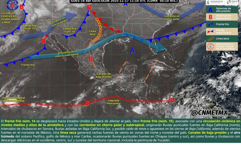 Hoy, se prevé que el frente frío núm. 14 se desplace hacia Estados Unidos y deje de afectar al país. Sin embargo, otro frente frío (núm. 15) se aproximará al noroeste de México, asociado con una circulación ciclónica en niveles medios y altos de la atmósfera, y con las corrientes en chorro polar y subtropical, originarán lluvias puntuales fuertes en Baja California (norte), intervalos de chubascos en Sonora y lluvias aisladas en Baja California Sur, con posible caída de nieve o aguanieve en las sierras de Baja California, además de vientos fuertes en el noroeste de México. Una línea seca sobre el norte de Coahuila ocasionará rachas fuertes de viento en zonas de Chihuahua, Durango, Coahuila, Nuevo León y Tamaulipas. Por otra parte, canales de baja presión sobre el interior del país y el sureste de México, así como el ingreso de humedad del océano Pacífico, golfo de México y mar Caribe, originarán lluvias y chubascos con descargas eléctricas en el occidente, centro, sur y sureste del territorio nacional, incluida la península de Yucatán, con lluvias puntuales fuertes en Chiapas (centro y sur). Finalmente, predominará cielo despejado y sin probabilidad de lluvia en el resto de la República Mexicana; ambiente frío a muy frío durante la mañana con posibles heladas en la Mesa del Norte y la Mesa Central.