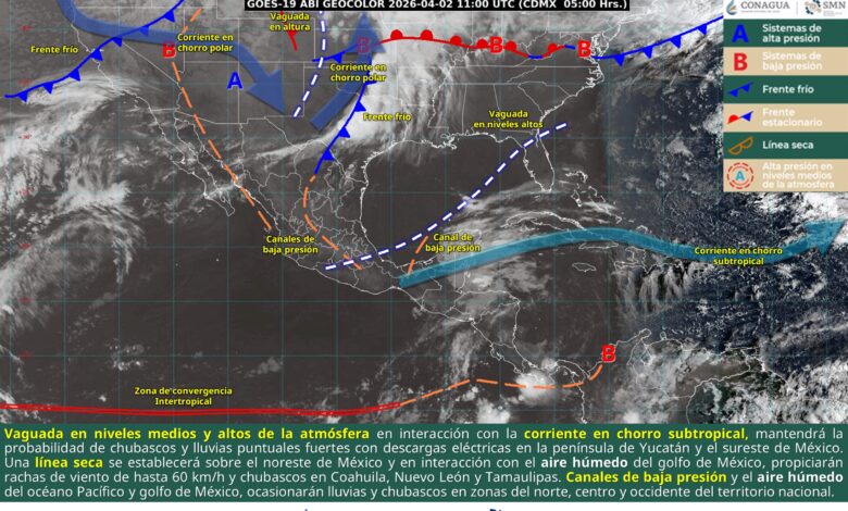 Para hoy, una vaguada en niveles altos de la atmósfera se desplazará gradualmente sobre la península de Yucatán y el mar Caribe, en interacción con la corriente en chorro subtropical, mantendrá la probabilidad de chubascos y lluvias puntuales fuertes con descargas eléctricas en dicha península, además del sureste de México. A su vez, por la tarde se establecerá una línea seca en el norte del país en interacción con la entrada de humedad del golfo de México, propiciarán rachas de viento de hasta 60 km/h y chubascos en Coahuila, Nuevo León y Tamaulipas. Simultáneamente, canales de baja presión en el interior del país y el ingreso de humedad del océano Pacífico y golfo de México, propiciarán lluvias y chubascos en zonas del norte, centro y occidente del territorio nacional. Finalmente, continuará la onda de calor en zonas de Jalisco (centro, sur y suroeste), Michoacán (centro y oeste), Guerrero (noroeste, centro y sur) y Oaxaca (centro, este y sureste).