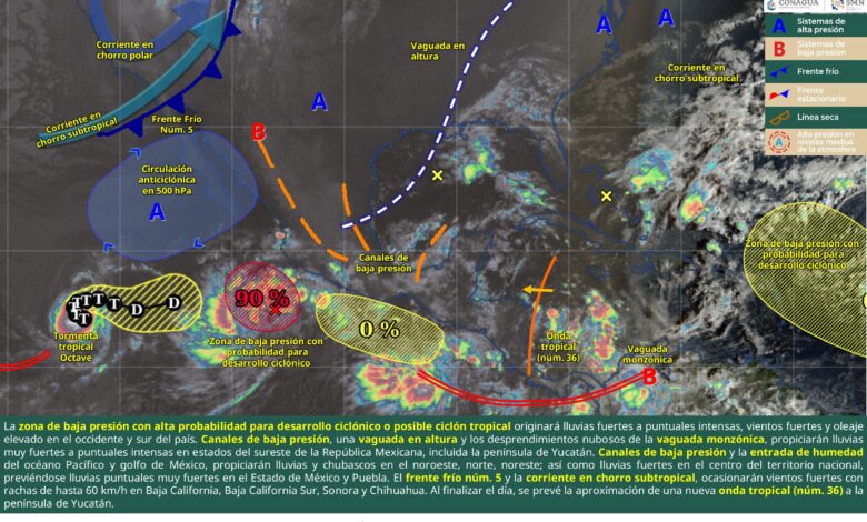 Para hoy, la zona de baja presión con alta probabilidad para desarrollo ciclónico o posible ciclón tropical, se desplaza lentamente y cerca de las costas de Jalisco, Colima y Michoacán. Su amplia circulación originará lluvias puntuales intensas en Michoacán y Guerrero, lluvias puntuales muy fuertes en Jalisco y Colima y puntuales fuertes en Nayarit, vientos fuertes y oleaje elevado en los estados mencionados. Canales de baja presión, uno en el centro y sur del golfo de México y el otro en el sureste del país, en interacción con una vaguada en altura y los desprendimientos nubosos de la vaguada monzónica en el Pacífico Sur Mexicano, propiciarán lluvias muy fuertes a puntuales intensas en estados del sureste de la República Mexicana, incluida la península de Yucatán. Canales de baja presión en el interior del país, en interacción con la entrada de humedad del océano Pacífico y golfo de México, propiciarán lluvias y chubascos en el noroeste, norte, noreste; así como lluvias fuertes en el centro del territorio nacional, previéndose lluvias puntuales muy fuertes en el Estado de México y Puebla, las cuales podrían acompañarse con descargas eléctricas y caída de granizo. Por otra parte, el frente frío núm. 5 se extenderá sobre el noroeste y norte de México, en combinación con la corriente en chorro subtropical, ocasionarán vientos fuertes con rachas de hasta 60 km/h en Baja California, Baja California Sur, Sonora y Chihuahua. Al finalizar el día, se prevé la aproximación de una nueva onda tropical (núm. 36), a la península de Yucatán.