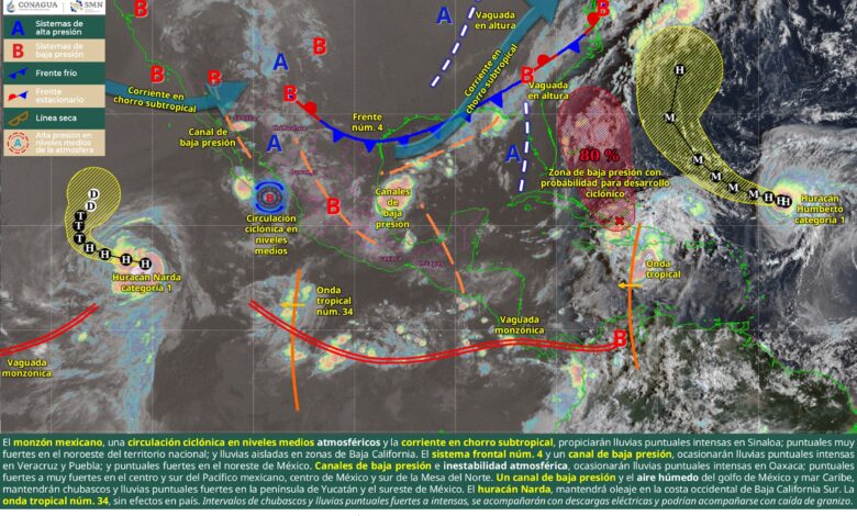 Para hoy, el monzón mexicano y una circulación ciclónica en niveles medios de la atmósfera, sobre el sur del golfo de California, así como la corriente en chorro subtropical, propiciarán lluvias puntuales intensas en Sinaloa; puntuales muy fuertes en Baja California Sur, Nayarit, Durango, Chihuahua y Sonora; y lluvias aisladas en zonas de Baja California. Por otra parte, el sistema frontal núm. 4 prevalecerá sobre los estados fronterizos del noreste del país y en combinación con un canal de baja presión sobre el oriente del territorio nacional, ocasionarán lluvias puntuales intensas en Veracruz y Puebla; y puntuales fuertes en Tamaulipas, Nuevo León y Coahuila. Simultáneamente, canales de baja presión sobre el interior de la República Mexicana e inestabilidad atmosférica, ocasionarán lluvias puntuales intensas en Oaxaca; puntuales muy fuertes en Guerrero, Morelos, Estado de México, Michoacán, Colima, Jalisco, Guanajuato y San Luis Potosí; y puntuales fuertes en Tlaxcala, Ciudad de México, Hidalgo, Querétaro, Aguascalientes y Zacatecas. A su vez, un canal de baja presión sobre el sureste mexicano y el ingreso de aire húmedo del golfo de México y mar Caribe, mantendrán la probabilidad de lluvias puntuales fuertes en Yucatán, Tabasco y Chiapas; y chubascos en Quintana Roo y Campeche. Por su parte, la onda tropical núm. 34 que se desplazará al sur de las costas de Jalisco, sin generar efectos en el territorio nacional, mientras que el huracán Narda, alejado de costas nacionales, mantendrá oleaje elevado en la costa occidental de Baja California Sur. Finalmente, continuará el ambiente cálido a caluroso por la tarde en la mayor parte del territorio nacional, con temperaturas máximas mayores a 35 °C en zonas de Baja California, Baja California Sur, Sonora, Sinaloa, Coahuila, Nuevo León, San Luis Potosí, Jalisco, Colima, Michoacán, Guerrero, Oaxaca, Chiapas, Tamaulipas, Tabasco, Veracruz, Campeche y Yucatán.