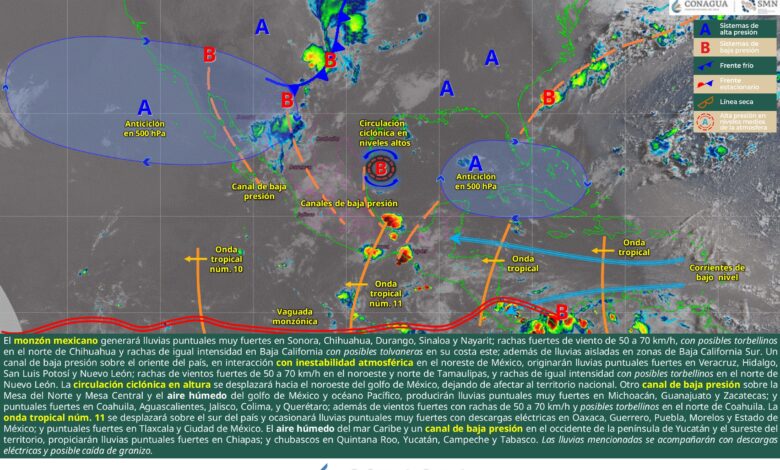 Para hoy, el monzón mexicano generará lluvias puntuales muy fuertes en Sonora, Chihuahua, Durango, Sinaloa y Nayarit, así como rachas fuertes de viento de 50 a 70 km/h, con posible formación de torbellinos en el norte de Chihuahua, y rachas de igual intensidad en Baja California, con posibles tolvaneras en su costa este; además de lluvias aisladas en zonas de Baja California Sur. A su vez, un canal de baja presión sobre el oriente del país, en interacción con inestabilidad atmosférica en el noreste de México, originarán lluvias puntuales fuertes en Veracruz, Hidalgo, San Luis Potosí y Nuevo León, así como rachas de vientos fuertes de 50 a 70 km/h en el noroeste y norte de Tamaulipas, y rachas de igual intensidad con posible formación de torbellinos en el norte de Nuevo León. La circulación ciclónica en altura se desplazará hacia el noroeste del golfo de México, dejando de afectar al territorio nacional. Otro canal de baja presión extendido sobre la Mesa del Norte y Mesa Central y el ingreso de aire húmedo del golfo de México y océano Pacífico, producirán lluvias puntuales muy fuertes en Michoacán, Guanajuato y Zacatecas; y puntuales fuertes en Coahuila, Aguascalientes, Jalisco, Colima, y Querétaro, además de vientos fuertes con rachas de 50 a 70 km/h y posible formación de torbellinos en el norte de Coahuila. La onda tropical núm. 11 se desplazará sobre el sur del país y ocasionará lluvias puntuales muy fuertes con descargas eléctricas en Oaxaca, Guerrero, Puebla, Morelos y Estado de México; y puntuales fuertes en Tlaxcala y Ciudad de México. El ingreso de aire húmedo del mar Caribe y un canal de baja presión en el occidente de la península de Yucatán y el sureste del territorio, propiciarán lluvias puntuales fuertes en Chiapas; y chubascos en Quintana Roo, Yucatán, Campeche y Tabasco. Finalmente, un sistema anticiclónico en niveles medios de la atmósfera sobre el noroeste mexicano mantendrá el ambiente caluroso a muy caluroso por la tarde sobre entidades del noroeste y norte del territorio mexicano, y extremadamente caluroso con temperaturas máximas superiores a 45 °C en el noreste de Baja California. Las lluvias mencionadas se acompañarán con descargas eléctricas y posible caída de granizo.