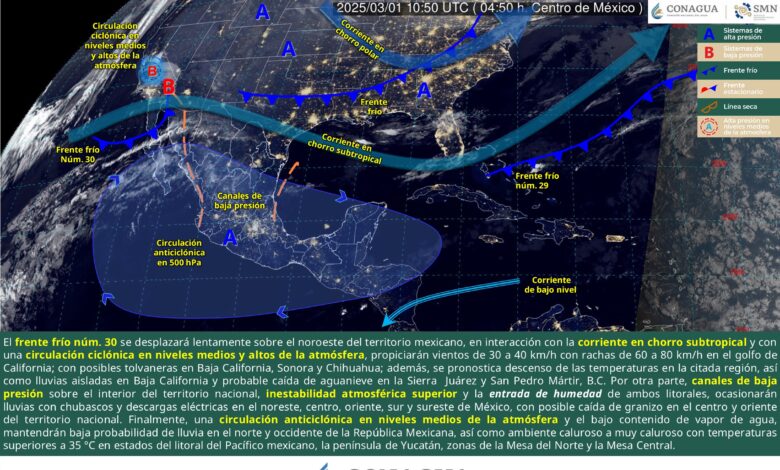 Para este día, el frente frío núm. 30 se desplazará lentamente sobre el noroeste del territorio mexicano, en interacción con la corriente en chorro subtropical y con una circulación ciclónica en niveles medios y altos de la atmósfera, propiciarán vientos de 30 a 40 km/h con rachas de 60 a 80 km/h en el golfo de California; con posibles tolvaneras en Baja California, Sonora y Chihuahua; además, se pronostica descenso de las temperaturas en la citada región, así como lluvias aisladas en Baja California y probable caída de aguanieve en la Sierra Juárez y San Pedro Mártir, B.C. Por otra parte, canales de baja presión sobre el interior del territorio nacional, inestabilidad atmosférica superior y la entrada de humedad de ambos litorales, ocasionarán lluvias con chubascos y descargas eléctricas en el noreste, centro, oriente, sur y sureste de México con posible caída de granizo en el centro y oriente del territorio nacional. Finalmente, una circulación anticiclónica en niveles medios de la atmósfera y el bajo contenido de vapor de agua, mantendrán baja probabilidad de lluvia en el norte y occidente de la República Mexicana, así como ambiente caluroso a muy caluroso con temperaturas superiores a 35 °C en estados del litoral del Pacífico mexicano, la península de Yucatán, zonas de la Mesa del Norte y la Mesa Central.