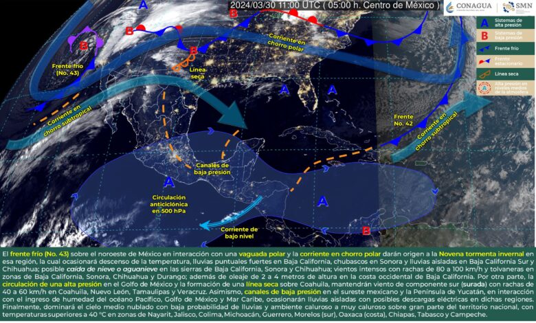 Este día, el frente frío (No. 43) sobre el noroeste de México en interacción con una vaguada polar y la corriente en chorro polar darán origen a la Novena tormenta invernal en esa región, la cual ocasionará descenso de la temperatura, lluvias puntuales fuertes en Baja California, chubascos en Sonora y lluvias aisladas en Baja California Sur y Chihuahua; posible caída de nieve o aguanieve en las sierras de Baja California, Sonora y Chihuahua; vientos intensos con rachas de 80 a 100 km/h y tolvaneras en zonas de Baja California, Sonora, Chihuahua y Durango; además de oleaje de 2 a 4 metros de altura en la costa occidental de Baja California. Por otra parte, la circulación de una alta presión en el Golfo de México y la formación de una línea seca sobre Coahuila, mantendrán viento de componente sur (surada) con rachas de 40 a 60 km/h en Coahuila, Nuevo León, Tamaulipas y Veracruz. Asimismo, canales de baja presión en el sureste mexicano y la Península de Yucatán, en interacción con el ingreso de humedad del océano Pacífico, Golfo de México y Mar Caribe, ocasionarán lluvias aisladas con posibles descargas eléctricas en dichas regiones. Finalmente, dominará el cielo medio nublado con baja probabilidad de lluvias y ambiente caluroso a muy caluroso sobre gran parte del territorio nacional, con temperaturas superiores a 40 °C en zonas de Nayarit, Jalisco, Colima, Michoacán, Guerrero, Morelos (sur), Oaxaca (costa), Chiapas, Tabasco y Campeche.