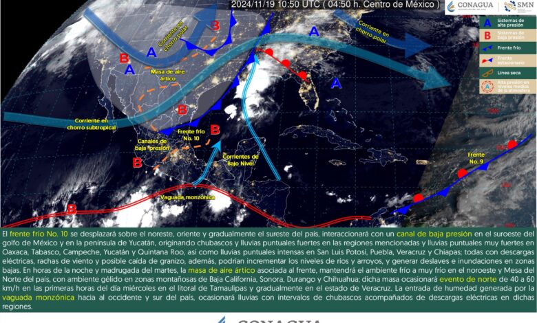 Durante este día, el frente frío No. 10 se desplazará sobre el noreste, oriente y gradualmente el sureste del país, interaccionará con un canal de baja presión en el suroeste del golfo de México y en la península de Yucatán, originando chubascos y lluvias puntuales fuertes en las regiones mencionadas y lluvias puntuales muy fuertes en Oaxaca, Tabasco, Campeche, Yucatán y Quintana Roo, así como lluvias puntuales intensas en San Luis Potosí, Puebla, Veracruz y Chiapas. Dichas lluvias estarán acompañadas de descargas eléctricas, rachas de viento y posible caída de granizo, además, podrían incrementar los niveles de ríos y arroyos, así como generar deslaves e inundaciones en zonas bajas de los estados mencionados. Por su parte, se prevé que, en horas de la noche y madrugada del martes, la masa de aire ártico asociada al frente, mantendrá el ambiente frío a muy frío en estados del noroeste y Mesa del Norte del país, con ambiente gélido en zonas montañosas de Baja California, Sonora, Durango y Chihuahua, asimismo, dicha masa ocasionará evento de norte de 40 a 60 km/h en las primeras horas del día miércoles en el litoral de Tamaulipas y gradualmente en el estado de Veracruz. Por otro lado, la entrada de humedad generada por la vaguada monzónica hacia al occidente y sur del país, ocasionará lluvias con intervalos de chubascos acompañados de descargas eléctricas en dichas regiones.