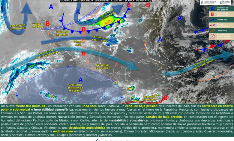 Durante este día, un nuevo frente frío (núm. 41), en interacción con una línea seca sobre Coahuila, un canal de baja presión en el noreste del país, con las corrientes en chorro polar y subtropical e inestabilidad atmosférica, ocasionarán vientos fuertes a muy fuertes en el norte de la República Mexicana, con lluvias y chubascos en Chihuahua y San Luis Potosí, así como lluvias fuertes a muy fuertes, caída de granizo y rachas de viento de 70 a 90 km/h con posible formación de torbellinos o tornados en zonas de Coahuila (norte), Nuevo León (norte) y Tamaulipas (noroeste). Por otra parte, canales de baja presión, en combinación con el ingreso de humedad del océano Pacífico, golfo de México y mar Caribe, además de inestabilidad atmosférica, originarán lluvias y chubascos con descargas eléctricas y posible caída de granizo en el occidente, centro, oriente, sur y sureste del país, incluida la península de Yucatán; además de lluvias puntuales fuertes a muy fuertes en Puebla, Oaxaca y Chiapas. Finalmente, una circulación anticiclónica en niveles medios de la atmósfera, mantendrá ambiente caluroso a muy caluroso en el territorio nacional, prevaleciendo la onda de calor en Jalisco (centro, sur y suroeste), Colima (noreste), Michoacán (oeste, sur, centro y este), Guerrero (noroeste, norte y noreste), Oaxaca (centro y sur), Chiapas (noroeste y sureste) y Morelos.