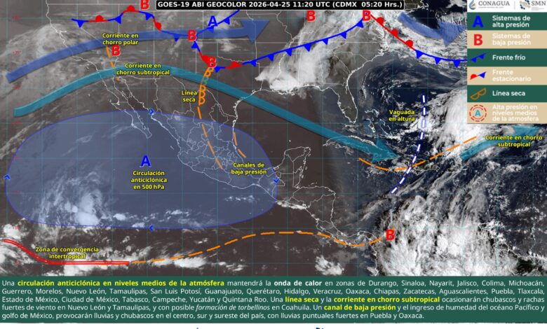 Para este día, una circulación anticiclónica en niveles medios de la atmósfera sobre el occidente del territorio nacional mantendrá la onda de calor en Durango (noroeste), Sinaloa (centro), Nayarit (sur), Jalisco (oeste y sur), Colima (este), Michoacán (sur y suroeste), Guerrero (noroeste, este y sur), Morelos, Nuevo León (sur), Tamaulipas (suroeste), San Luis Potosí (centro y sur), Guanajuato (noreste), Querétaro (centro), Hidalgo (norte y este), Veracruz (centro), Oaxaca (sur) y Chiapas (centro y noreste), extendiéndose a partir de este día hacia Zacatecas (norte, centro y sur), Aguascalientes, Puebla (norte y suroeste), Tlaxcala (este y sur), Estado de México (noreste y suroeste), Ciudad de México, Tabasco (centro y este), Campeche (costa), Yucatán (oeste y suroeste) y Quintana Roo (oeste). Por otra parte, una línea seca se extenderá sobre el noreste de México e interaccionará con la corriente en chorro subtropical, ocasionando chubascos y rachas fuertes de viento en Nuevo León y Tamaulipas, y con posible formación de torbellinos en Coahuila. Simultáneamente, un canal de baja presión sobre el centro, oriente y sureste del país, y el ingreso de humedad del océano Pacífico y golfo de México, provocarán lluvias y chubascos en las regiones mencionadas, además del sur de la República Mexicana, con lluvias puntuales fuertes en Puebla (este) y Oaxaca (centro).