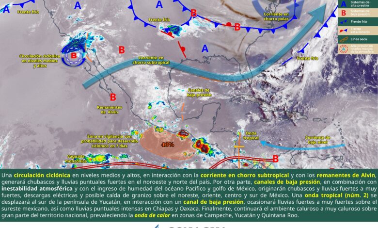 Durante este día, una circulación ciclónica en niveles medios y altos prevalecerá sobre el noroeste de la República Mexicana, en interacción con la corriente en chorro subtropical y con los remanentes de Alvin, generará chubascos y lluvias puntuales fuertes en el noroeste y norte del país. Por otra parte, canales de baja presión, en combinación con inestabilidad atmosférica y con el ingreso de humedad del océano Pacífico y golfo de México, originarán chubascos y lluvias fuertes a muy fuertes acompañadas con descargas eléctricas y posible caída de granizo sobre el noreste, oriente, centro y sur de México. Una onda tropical (núm. 2) se desplazará al sur de la península de Yucatán, en interacción con un canal de baja presión, ocasionará lluvias fuertes a muy fuertes sobre el sureste mexicano, así como lluvias puntuales intensas en Chiapas y Oaxaca. Finalmente, continuará el ambiente caluroso a muy caluroso sobre gran parte del territorio nacional, prevaleciendo la onda de calor en zonas de Campeche, Yucatán y Quintana Roo.