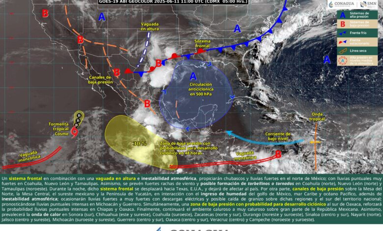 Durante este día, un sistema frontal en combinación con una vaguada en altura e inestabilidad atmosférica, propiciarán chubascos y lluvias fuertes en el norte de México; con lluvias puntuales muy fuertes en Coahuila, Nuevo León y Tamaulipas. Asimismo, se prevén fuertes rachas de viento y posible formación de torbellinos o tornados en Coahuila (norte), Nuevo León (norte) y Tamaulipas (noroeste). Durante la noche, dicho sistema frontal se desplazará hacia Texas, E.U.A., y dejará de afectar al país. Por otra parte, canales de baja presión sobre la Mesa del Norte, la Mesa Central, el sureste mexicano y la Península de Yucatán, en interacción con el ingreso de humedad del golfo de México, mar Caribe y océano Pacífico, además de inestabilidad atmosférica; ocasionarán lluvias fuertes a muy fuertes con descargas eléctricas y posible caída de granizo sobre dichas regiones y el sur del territorio nacional; pronosticándose lluvias puntuales intensas en Michoacán y Guerrero. Simultáneamente, una zona de baja presión con probabilidad para desarrollo ciclónico al sur de Oaxaca, reforzará la probabilidad lluvias puntuales intensas en Chiapas y Oaxaca. Finalmente, continuará el ambiente caluroso a muy caluroso sobre gran parte de la República Mexicana. Asimismo, prevalecerá la onda de calor en Sonora (sur), Chihuahua (este y sureste), Coahuila (suroeste), Zacatecas (norte y sur), Durango (noreste y suroeste), Sinaloa (centro y sur), Nayarit (norte), Jalisco (centro y sureste), Michoacán (suroeste y sureste), Guerrero (centro y sur), Oaxaca (centro y sur), Veracruz (centro) y Campeche (noroeste y suroeste).