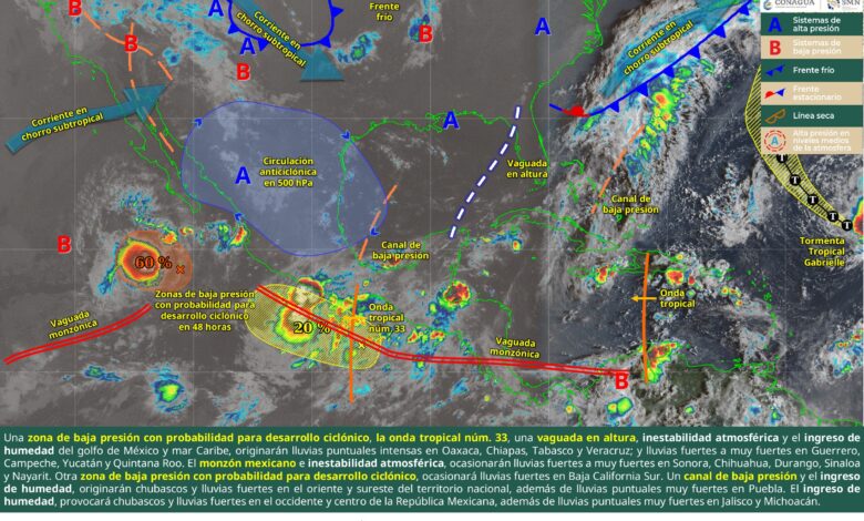 Este día, una zona de baja presión con probabilidad para desarrollo ciclónico frente a las costas de Oaxaca, interaccionará con la onda tropical núm. 33 que se desplazará sobre el sur y gradualmente sobre el centro del país, con una vaguada en altura sobre el sureste del golfo de México, con inestabilidad atmosférica y con el ingreso de humedad del golfo de México y mar Caribe, lo cual originará lluvias puntuales intensas acompañadas con descargas eléctricas en Oaxaca, Chiapas, Tabasco y Veracruz, además de lluvias fuertes a muy fuertes en Guerrero, Campeche, Yucatán y Quintana Roo. A su vez, el monzón mexicano en combinación con inestabilidad atmosférica, ocasionarán lluvias fuertes a muy fuertes en Sonora, Chihuahua, Durango, Sinaloa y Nayarit. Otra zona de baja presión con probabilidad para desarrollo ciclónico al suroeste de Baja California Sur, ocasionará lluvias fuertes en dicho estado, así como rachas de viento de 30 a 50 km/h y oleaje de 1.5 a 2.5 metros de altura en sus costas. Asimismo, un canal de baja presión en el noreste y oriente del territorio nacional y el ingreso de humedad del golfo de México, originarán chubascos y lluvias fuertes con descargas eléctricas en dichas regiones, con lluvias puntuales muy fuertes en Puebla. Simultáneamente, el ingreso de humedad del golfo de México y océano Pacífico, provocará chubascos y lluvias fuertes en el occidente y centro de la República Mexicana, además de lluvias puntuales muy fuertes en Jalisco y Michoacán.