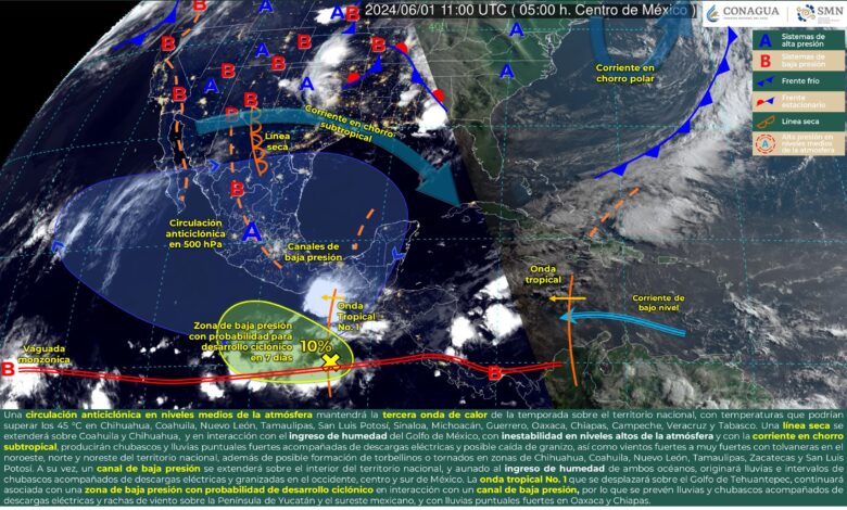 Para hoy, una circulación anticiclónica en niveles medios de la atmósfera mantendrá la tercera onda de calor de la temporada sobre el territorio nacional, con temperaturas que podrían superar los 45 °C en Chihuahua, Coahuila, Nuevo León, Tamaulipas, San Luis Potosí, Sinaloa, Michoacán, Guerrero, Oaxaca, Chiapas, Campeche, Veracruz y Tabasco. Por la tarde, una línea seca se extenderá sobre Coahuila y Chihuahua, en interacción con el ingreso de humedad del Golfo de México, con inestabilidad en niveles altos de la atmósfera y con la corriente en chorro subtropical, producirán chubascos y lluvias puntuales fuertes acompañadas de descargas eléctricas y posible caída de granizo, así como vientos fuertes a muy fuertes con tolvaneras en el norte y noreste del territorio nacional, además de posible formación de torbellinos o tornados en zonas de Chihuahua, Coahuila, Nuevo León, Tamaulipas, Zacatecas y San Luis Potosí. A su vez, un canal de baja presión se extenderá sobre el interior del territorio nacional, aunado al ingreso de humedad de ambos océanos, originará lluvias e intervalos de chubascos acompañados de descargas eléctricas y granizadas en el occidente, centro y sur de México. Finalmente, la onda tropical No. 1 se desplazará sobre el Golfo de Tehuantepec, continuará asociada con una zona de baja presión con probabilidad de desarrollo ciclónico en interacción con un canal de baja presión que se extenderá sobre la Península de Yucatán y el sureste mexicano, por lo que se prevén lluvias y chubascos acompañados de descargas eléctricas y rachas de viento en las regiones mencionadas, con lluvias puntuales fuertes en Oaxaca y Chiapas.