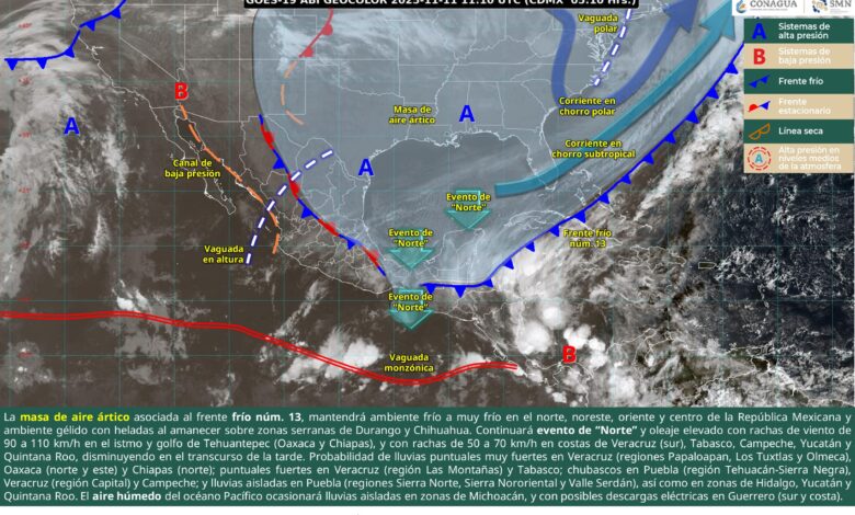 Para hoy, la masa de aire ártico asociada al frente frío núm. 13, mantendrá ambiente frío a muy frío en el norte, noreste, oriente y centro de la República Mexicana y ambiente gélido con heladas al amanecer sobre zonas serranas de Durango y Chihuahua; además continuará evento de “Norte” y oleaje elevado con rachas de viento de 90 a 110 km/h en el istmo y golfo de Tehuantepec (Oaxaca y Chiapas), y con rachas de 50 a 70 km/h en costas de Veracruz (sur), Tabasco, Campeche, Yucatán y Quintana Roo, disminuyendo en el transcurso de la tarde. Asimismo, continuará la probabilidad de lluvias puntuales muy fuertes en Veracruz (regiones Papaloapan, Los Tuxtlas y Olmeca), Oaxaca (norte y este) y Chiapas (norte); puntuales fuertes en Veracruz (región Las Montañas) y Tabasco; chubascos en Puebla (región Tehuacán-Sierra Negra), Veracruz (región Capital) y Campeche; y lluvias aisladas en Puebla (regiones Sierra Norte, Sierra Nororiental y Valle Serdán), así como en zonas de Hidalgo, Yucatán y Quintana Roo. Por otro lado, el ingreso de aire húmedo del océano Pacífico ocasionará lluvias aisladas en zonas de Michoacán, y con posibles descargas eléctricas en Guerrero (sur y costa). Para el occidente del país, predominará el cielo despejado a parcialmente nublado y sin lluvia en la región.