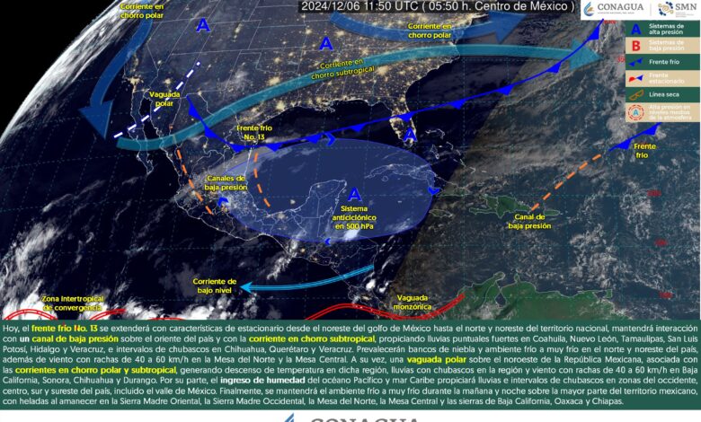 Hoy, el frente frío No. 13 se extiende desde el noreste del golfo de México hasta el norte y noreste del territorio nacional, mantendrá interacción con un canal de baja presión sobre el oriente del país y con la corriente en chorro subtropical, propiciando lluvias puntuales fuertes en Coahuila, Nuevo León, Tamaulipas, San Luis Potosí, Hidalgo, Puebla y Veracruz, e intervalos de chubascos en Chihuahua, Querétaro y Veracruz. Prevalecerán bancos de niebla y ambiente frío a muy frío en el norte y noreste del país, además de viento con rachas de 40 a 60 km/h en la Mesa del Norte y la Mesa Central. A su vez, una vaguada polar sobre el noroeste de la República Mexicana, asociada con las corrientes en chorro polar y subtropical, generando descenso de temperatura en dicha región, lluvias con chubascos en la región y viento con rachas de 40 a 60 km/h en Baja California, Sonora, Chihuahua y Durango. Por su parte, el ingreso de humedad del océano Pacífico y mar Caribe propiciará lluvias e intervalos de chubascos en zonas del occidente, centro, sur y sureste del país, incluido el valle de México. Finalmente, se mantendrá el ambiente frío a muy frío durante la mañana y noche sobre la mayor parte del territorio mexicano, con heladas al amanecer en la Sierra Madre Oriental, la Sierra Madre Occidental, la Mesa del Norte, la Mesa Central y las sierras de Baja California, Oaxaca y Chiapas.
