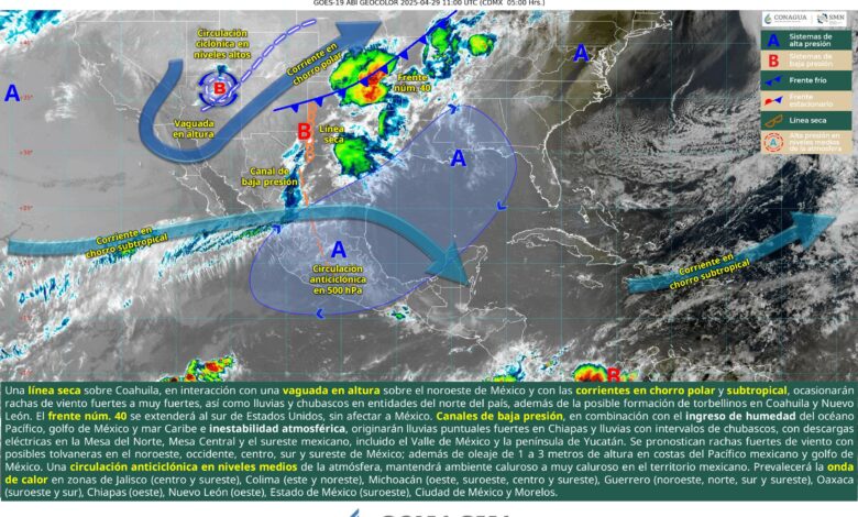 Para hoy, una línea seca sobre Coahuila, en interacción con una vaguada en altura sobre el noroeste de México y con las corrientes en chorro polar y subtropical, ocasionarán rachas de viento fuertes a muy fuertes, así como lluvias y chubascos en entidades del norte del país, además de la posible formación de torbellinos en Coahuila y Nuevo León. El frente núm. 40 se extenderá al sur de Estados Unidos, sin afectar a México. Por otro lado, canales de baja presión, en combinación con el ingreso de humedad del océano Pacífico, golfo de México y mar Caribe e inestabilidad atmosférica, originarán lluvias puntuales fuertes en Chiapas y lluvias con intervalos de chubascos, con descargas eléctricas en la Mesa del Norte, Mesa Central y el sureste mexicano, incluido el Valle de México y la península de Yucatán. A su vez, se pronostican rachas fuertes de viento con posibles tolvaneras en el noroeste, occidente, centro, sur y sureste de México; además de oleaje de 1 a 3 metros de altura en costas del Pacífico mexicano y golfo de México. Asimismo, una circulación anticiclónica en niveles medios de la atmósfera, mantendrá ambiente caluroso a muy caluroso en el territorio mexicano. Finalmente, prevalecerá la onda de calor en zonas de Jalisco (centro y sureste), Colima (este y noreste), Michoacán (oeste, suroeste, centro y sureste), Guerrero (noroeste, norte, sur y sureste), Oaxaca (suroeste y sur), Chiapas (oeste), Nuevo León (oeste), Estado de México (suroeste), Ciudad de México y Morelos.