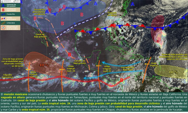 Para hoy, el monzón mexicano e inestabilidad atmosférica en el noroeste del país, ocasionará lluvias puntuales muy fuertes en Nayarit; puntuales fuertes en Sinaloa, lluvias con intervalos de chubascos en Baja California Sur, Sonora y Chihuahua; y lluvias aisladas en zonas de Baja California. Por otra parte, una vaguada en altura sobre el noreste y norte del territorio nacional, generará lluvias puntuales intensas en el centro y sur de Tamaulipas; puntuales muy fuertes en San Luis Potosí, Nuevo León, Zacatecas y Durango; y puntuales fuertes en Coahuila. Un canal de baja presión que se extenderá sobre la Mesa del Norte y la Mesa Central y el ingreso de aire húmedo procedente del océano Pacífico y el golfo de México, originarán lluvias puntuales muy fuertes en Oaxaca, Puebla, Guerrero, Estado de México, Querétaro, Guanajuato y Aguascalientes; así como lluvias puntuales fuertes en Veracruz, Morelos, Tlaxcala, Ciudad de México e Hidalgo. A su vez, la onda tropical núm. 24 que será absorbida por una zona de baja presión con probabilidad para desarrollo ciclónico frente a las costas del Pacífico central mexicano y el flujo de aire húmedo sobre dicha región, originará lluvias puntuales muy fuertes en Michoacán, Colima y Jalisco. Asimismo, un canal de baja presión sobre el sureste mexicano, en combinación con el ingreso de aire húmedo del golfo de México y mar Caribe y con la aproximación e ingreso de la onda tropical núm. 25 a la península de Yucatán, propiciarán lluvias puntuales muy fuertes en Chiapas; chubascos en Tabasco, Campeche y Quintana Roo; y lluvias aisladas en zonas de Yucatán. Finalmente, continuará el ambiente cálido a caluroso por la tarde sobre entidades del norte de la República Mexicana, estados del litoral del Pacífico y golfo de México, así como en la península de Yucatán; y muy caluroso en zonas del sur de la península de Baja California, noroeste del país y estados fronterizos del norte de México, llegando a ser extremadamente caluroso con temperaturas que podrán superar los 45 °C en el noreste de Baja California y noroeste de Sonora. A su vez, prevalecerá la onda de calor en Baja California, Baja California Sur y Oaxaca.