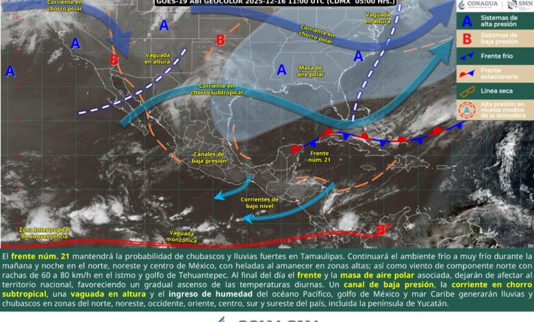 Este día, el frente núm. 21 se extenderá con características de estacionario sobre el golfo de México y noreste del país, manteniendo la probabilidad de chubascos y lluvias fuertes en Tamaulipas. Asimismo, continuará el ambiente frío a muy frío durante la mañana y noche en el norte, noreste y centro de México, con heladas al amanecer en zonas altas; así como viento de componente norte con rachas de 60 a 80 km/h en el istmo y golfo de Tehuantepec. Al final del día dicho frente y la masa de aire polar asociada, dejarán de afectar al país, favoreciendo un gradual ascenso de las temperaturas diurnas. Por otra parte, un canal de baja presión en el oriente y sureste del territorio nacional, la corriente en chorro subtropical, una vaguada en altura y el ingreso de humedad del océano Pacífico, golfo de México y mar Caribe generarán lluvias y chubascos en las regiones del norte, noreste, occidente, oriente, centro, sur y sureste del país, incluida la península de Yucatán.