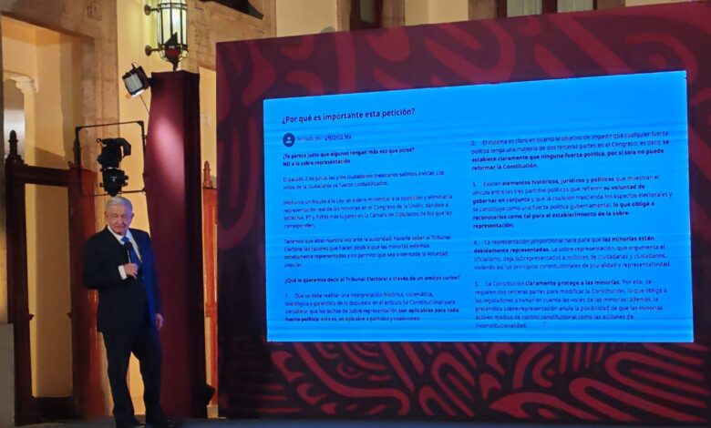 En el arranque de su conferencia de medios, el tabasqueño sostuvo que “ya entenderán la lección de la elección”, al tiempo de poner en la pantalla del Salón Tesorería de Palacio Nacional el “amicus curiae” bajo el cual sus oposites buscan se interprete lo escrito en el artículo 54 de la Constitución para que se les considere a la coalición de Morena y aliados como un solo partido y así impedir que en su conjunto el partido “guinda” y aliados no rebasen los 300 diputados y así impedir que tengan 2/3 partes del Congreso de la Unión y puedan reformar la Constitución para haber realidad el llamado Plan C.
