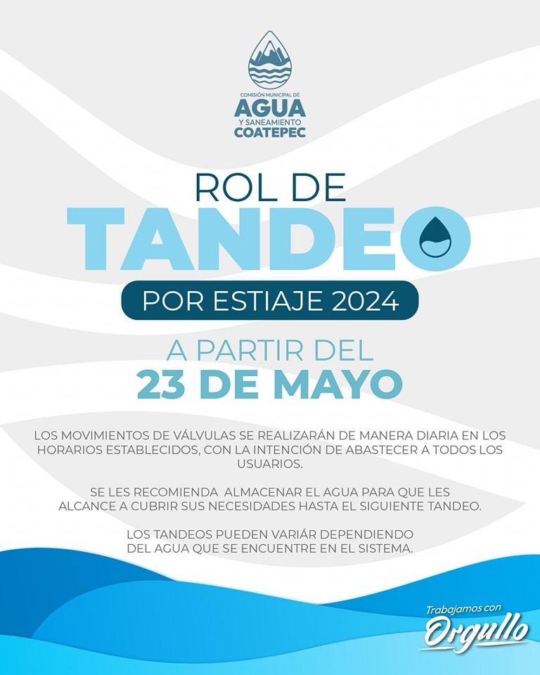 La Comisión Municipal de Agua y Saneamiento de Coatepec (CMAS) informó que los tandeos estarían vigentes a partir del jueves 23 de mayo.