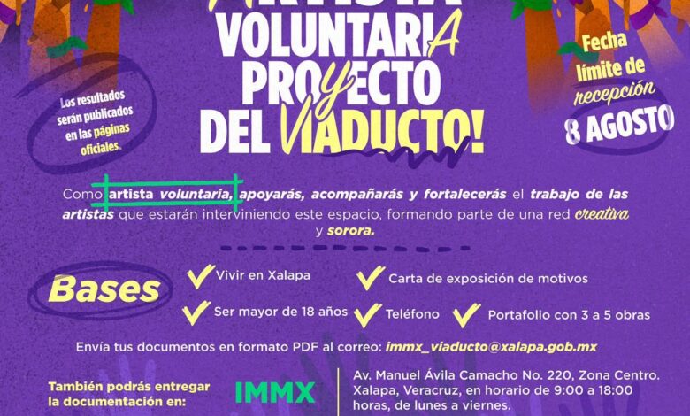 Entre las bases de la convocatoria están vivir en Xalapa, ser mayor de 18 años, una carta exposición de motivos, teléfono, portafolio de 3 a 5 obras y enviar los documentos en formato PDF al correo: immx_viaductoxalapa.gob.mx; la fecha límite de recepción es el 8 de agosto y los resultados serán publicados en las páginas oficiales.