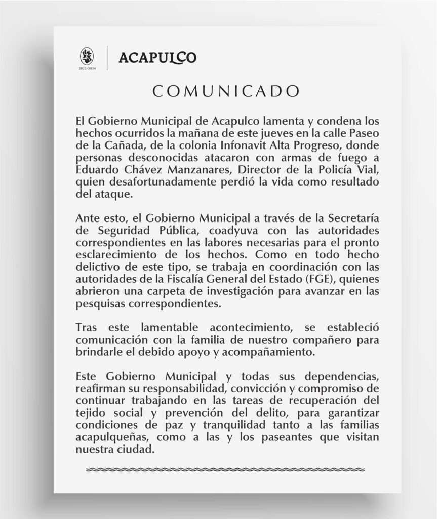 Eduardo Chávez Manzanares, director de la Policía Vial de Acapulco, fue asesinado por impactos del ataque con armas de fuego.