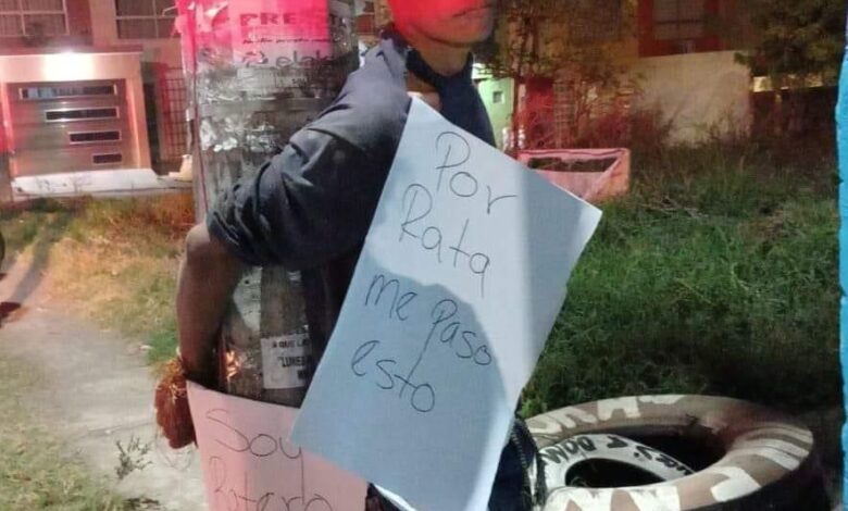 Por tal motivo, dejaron amarrado al presunto delincuente en un poste junto a unas cartulinas para exhibirlo.