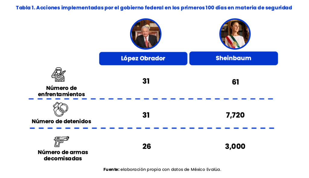 Por mencionar algunos datos, explicó que en lo que va del gobierno de Sheinbaum Pardo se han reportado 61 enfrentamientos con la delincuencia organizada, dejando como saldo más de 3 mil detenciones, y decomisos de armas y drogas.
