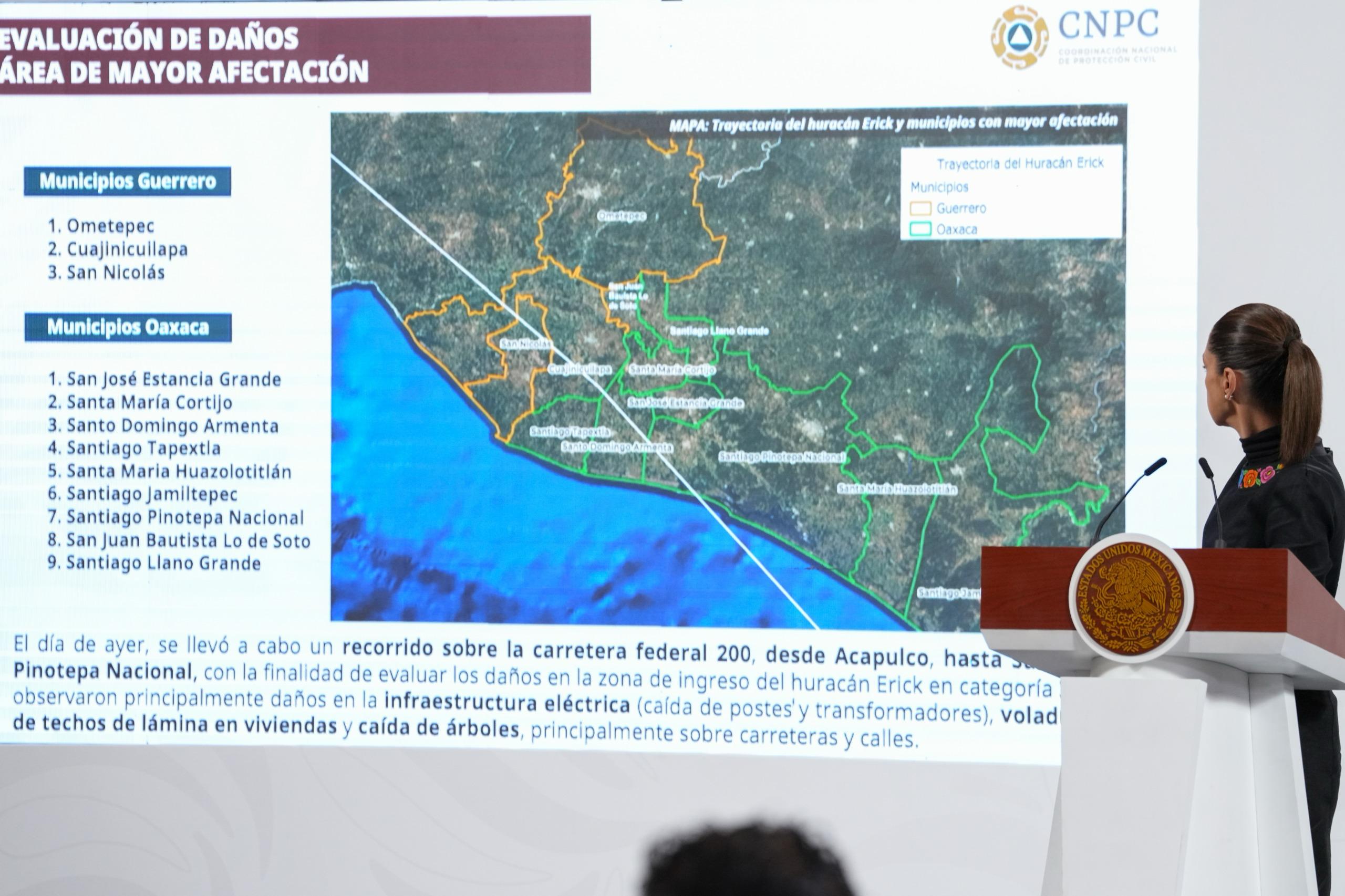 Carlos Guzmán. | Corresponsal CDMX.- con afectación importante en 3 municipios de Guerrero y 9 de Oaxaca, este viernes la Coordinadora Nacional de Protección Civil (CNPC), Laura Velázquez Alzúa reportó las afectaciones que dejó el huracán ‘Erick’.