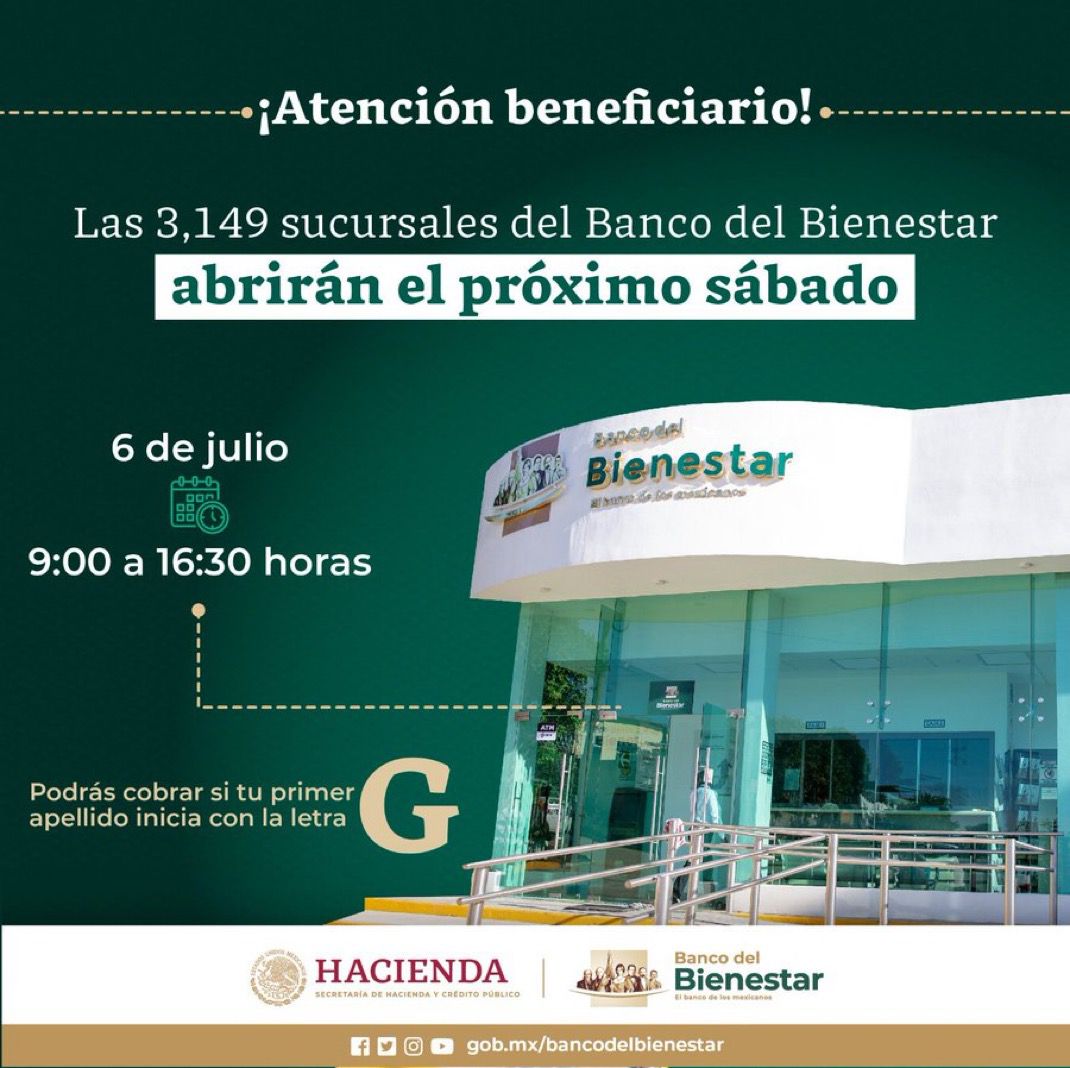 Finalmente, el funcionario anunció que este sábado, las sucursales del Banco del Bienestar permanecerán abiertas este sábado 6 de julio para que los beneficiarios de las Pensiones al Adulto Mayor, Discapacidad, y del programa Madres Trabajadoras, cuyo primer apellido inicia con la letra G, puedan cobrar sus apoyos.