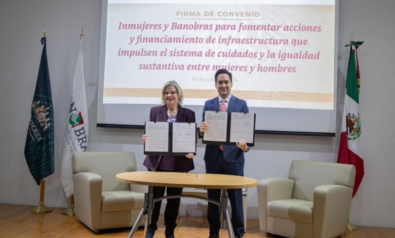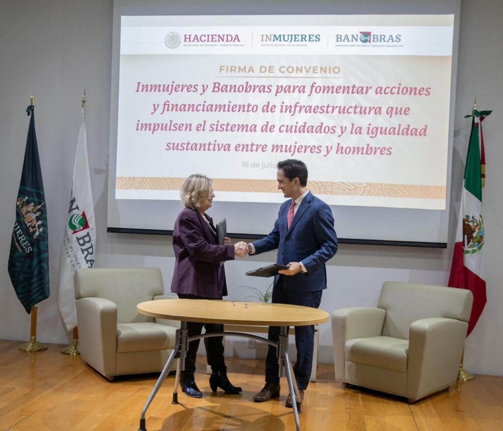El Banco Nacional de Obras y Servicios Públicos (Banobras) y el Instituto Nacional de las Mujeres (Inmujeres) firmaron un convenio para fortalecer e impulsar acciones tendientes a que el financiamiento del Banco impulse el trabajo de cuidados y la igualdad sustantiva entre mujeres y hombres.
