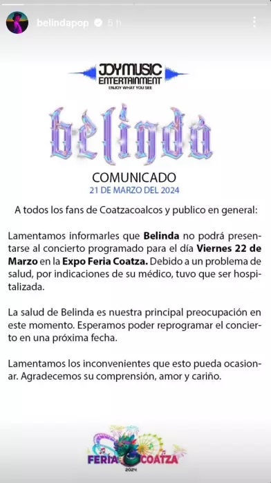 Momentos después, la empresa de Belinda hizo un comunicado para informar que el concierto en Coatzacoalcos, Veracruz, sería cancelado, por el bienestar de Belinda.