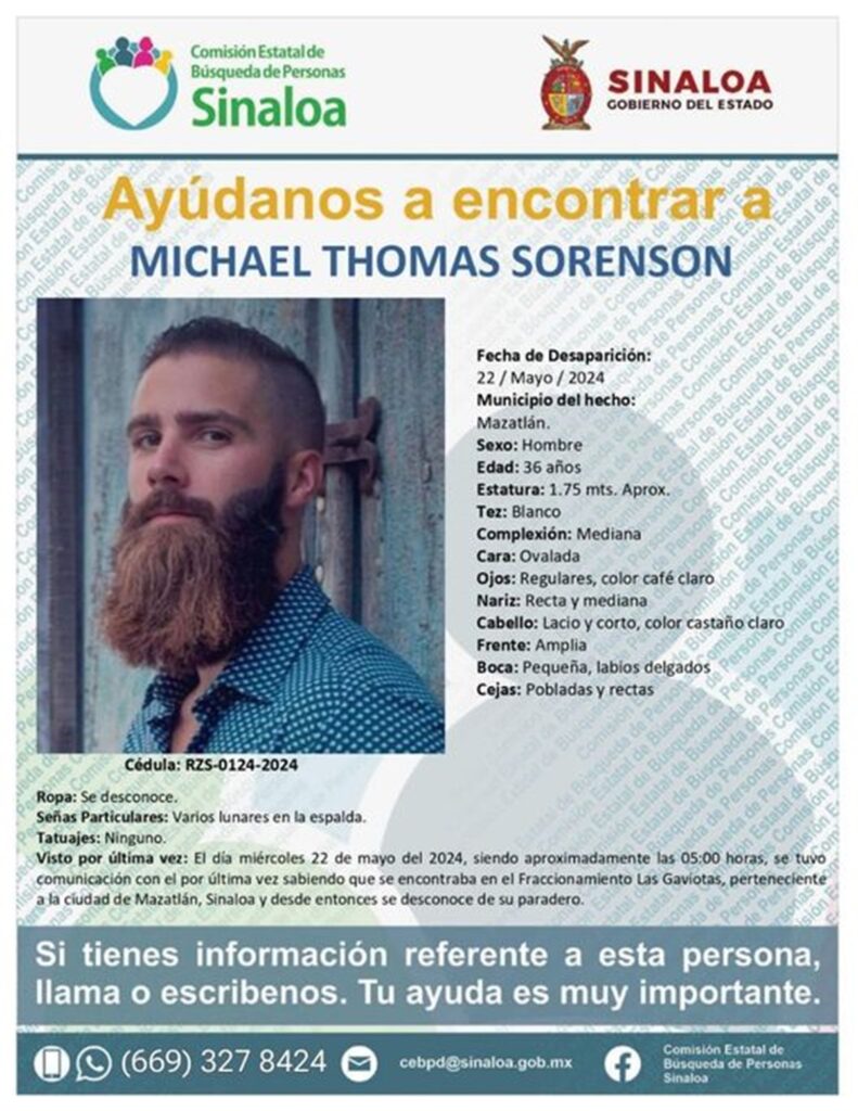 Michael Thomas Sorenson, de 36 años, fue visto por última vez en el Fraccionamiento Las Gaviotas el pasado 22 de mayo