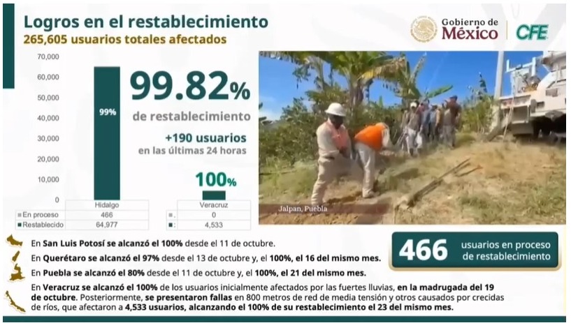 Carlos Guzmán | Corresponsal CDMX.- La directora general de la Comisión Federal de Electricidad (CFE), Emilia Calleja, informó que el suministro eléctrico en las zonas afectadas por las fuertes lluvias en la región oriente del país presenta un avance del 99.82% en su restablecimiento, destacando que el estado de Veracruz ya recuperó al 100% el servicio y que los trabajos continúan en Hidalgo, donde aún permanecen 466 usuarios pendientes.