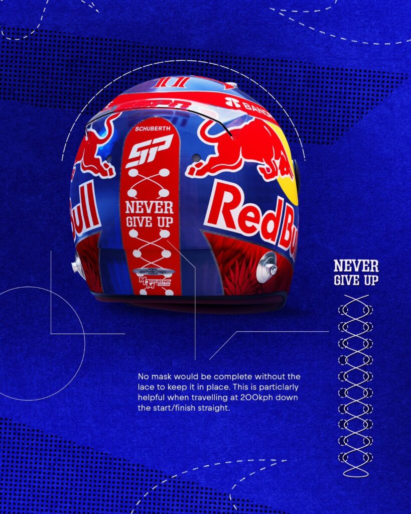 El piloto detalló «Siempre lo digo, se te olvida todo el apoyo que tienes cuando estás del otro lado del mundo y cuando llego a México es increíble, me hacen sentir en casa. Este casco es especial porque a mí me gusta mucho la cultura mexicana y la lucha libre. Creo que representa mucho la cultura mexicana que me encanta. Soy un luchador, quise ponerle una máscara al casco, es lo que vamos a tener el fin de semana, atrás tenemos las cintas».