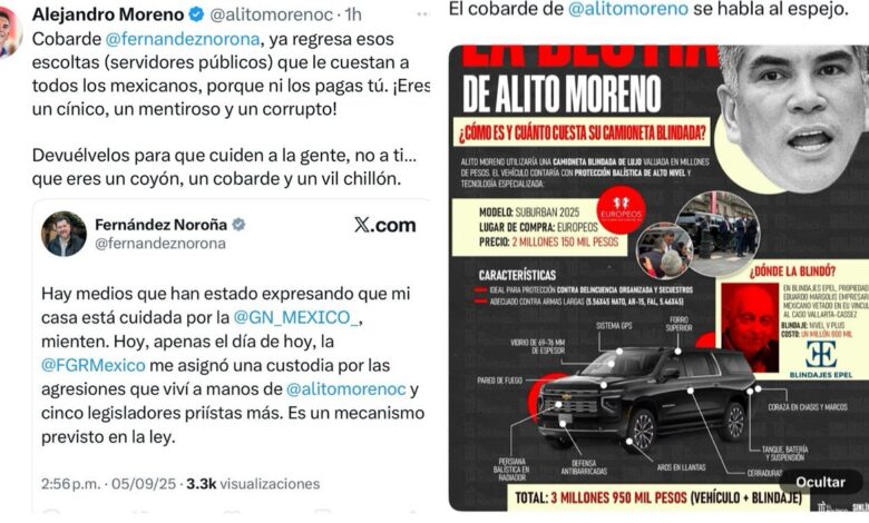 “Cobarde Fernández Noroña, regresa esos escoltas que le cuestan a todos los mexicanos, porque ni los pagas tú. ¡Eres un cínico, un mentiroso y un corrupto! Devuélvelos para que cuiden a la gente, no a ti… que eres un coyón, un cobarde y un vil chillón”, respondió en su cuenta de X.