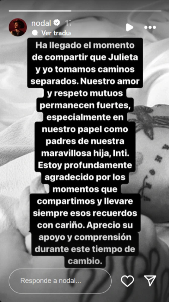 “Ha llegado el momento de compartir que Julieta y yo tomamos caminos separados. Nuestro amor y respeto mutuos permanecen fuertes, especialmente en nuestro papel como padres de nuestra maravillosa hija Inti”, es lo que publico el cantante mexicano en una historia de Instagram.