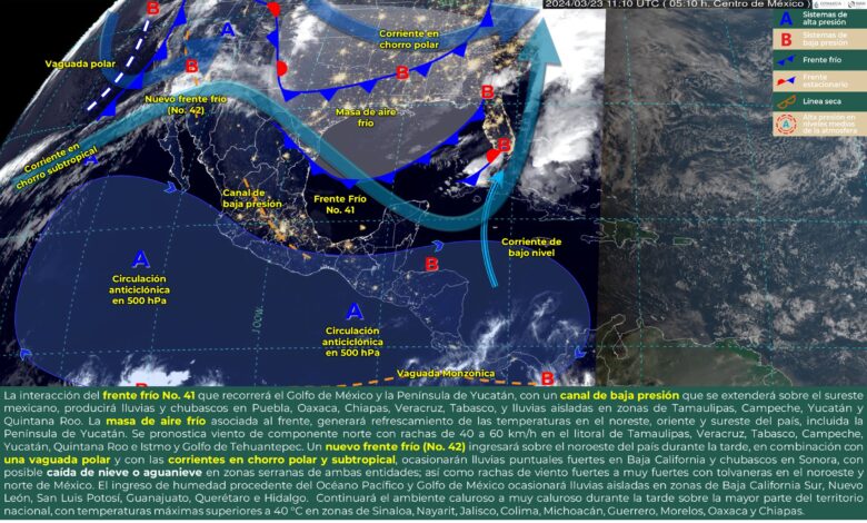 Para hoy, la interacción del frente frío No. 41 que recorrerá el Golfo de México y la Península de Yucatán, con un canal de baja presión que se extenderá sobre el sureste mexicano, producirá lluvias y chubascos en Puebla, Oaxaca, Chiapas, Veracruz, Tabasco, y lluvias aisladas en zonas de Tamaulipas, Campeche, Yucatán y Quintana Roo. La masa de aire frío asociada al frente, generará refrescamiento de las temperaturas en el noreste, oriente y sureste del país, incluida la Península de Yucatán. Asimismo, se pronostica viento de componente norte con rachas de 40 a 60 km/h en el litoral de Tamaulipas, Veracruz, Tabasco, Campeche, Yucatán, Quintana Roo e Istmo y Golfo de Tehuantepec. Al final del día, el frente frío No. 41 dejará de afectar al territorio nacional. Por otro lado, un nuevo frente frío (No. 42) ingresará sobre el noroeste del país durante la tarde, en combinación con una vaguada polar y con las corrientes en chorro polar y subtropical, ocasionarán lluvias puntuales fuertes en Baja California y chubascos en Sonora, con posible caída de nieve o aguanieve en zonas serranas de ambas entidades; así como rachas de viento fuertes a muy fuertes con tolvaneras en el noroeste y norte de México. El ingreso de humedad procedente del Océano Pacífico y Golfo de México ocasionará lluvias aisladas en zonas de Baja California Sur, Nuevo León, San Luis Potosí, Guanajuato, Querétaro e Hidalgo. Finalmente, continuará el ambiente caluroso a muy caluroso durante la tarde sobre la mayor parte del territorio nacional, con temperaturas máximas superiores a 40 °C en zonas de Sinaloa, Nayarit, Jalisco, Colima, Michoacán, Guerrero, Morelos, Oaxaca y Chiapas.