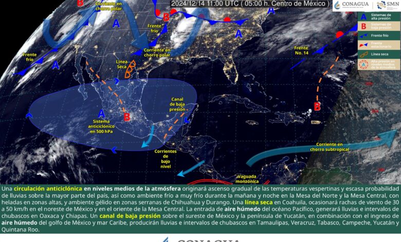 Para hoy, una circulación anticiclónica en niveles medios de la atmósfera originará ascenso gradual de las temperaturas vespertinas y escasa probabilidad de lluvias sobre la mayor parte del país. Sin embargo, y debido a que predominará el cielo despejado, prevalecerá el ambiente frío a muy frío durante la mañana y noche en la Mesa del Norte y la Mesa Central, con heladas en zonas altas, así como ambiente gélido en zonas serranas de Chihuahua y Durango. Una línea seca situada en Coahuila, ocasionará rachas de viento de 30 a 50 km/h en el noreste de México y en el oriente de la Mesa Central. Por su parte, la entrada de aire húmedo del océano Pacífico, generará lluvias e intervalos de chubascos en Oaxaca y Chiapas. Un canal de baja presión sobre el sureste de México y la península de Yucatán, en combinación con el ingreso de aire húmedo del golfo de México y mar Caribe, producirán lluvias e intervalos de chubascos en Tamaulipas, Veracruz, Tabasco, Campeche, Yucatán y Quintana Roo.