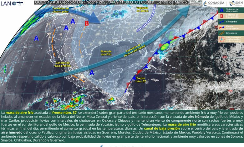 Para hoy, la masa de aire frío, asociada al frente núm. 37, se extenderá sobre gran parte del territorio mexicano, manteniendo ambiente frío a muy frío con posibles heladas al amanecer en estados de la Mesa del Norte, Mesa Central y oriente del país, en interacción con la entrada de aire húmedo del golfo de México y mar Caribe, producirán lluvias con intervalos de chubascos en Oaxaca y Chiapas. Asimismo, persistirá viento de componente norte con rachas fuertes a muy fuertes en el sur del litoral del golfo de México, la península de Yucatán, istmo y golfo de Tehuantepec. Se prevé que la masa de aire frío modifique sus características térmicas al final del día, permitiendo el aumento gradual en las temperaturas diurnas. Por otro lado, un canal de baja presión sobre el centro del país y la entrada de aire húmedo del océano Pacífico, originarán lluvias aisladas en Guerrero, Morelos, Ciudad de México, Estado de México, Puebla y Veracruz. Finalmente, continuará el ambiente vespertino cálido a caluroso con baja probabilidad de lluvias en gran parte del territorio nacional, y ambiente muy caluroso en zonas de Sonora, Sinaloa, Chihuahua, Durango y Guerrero.